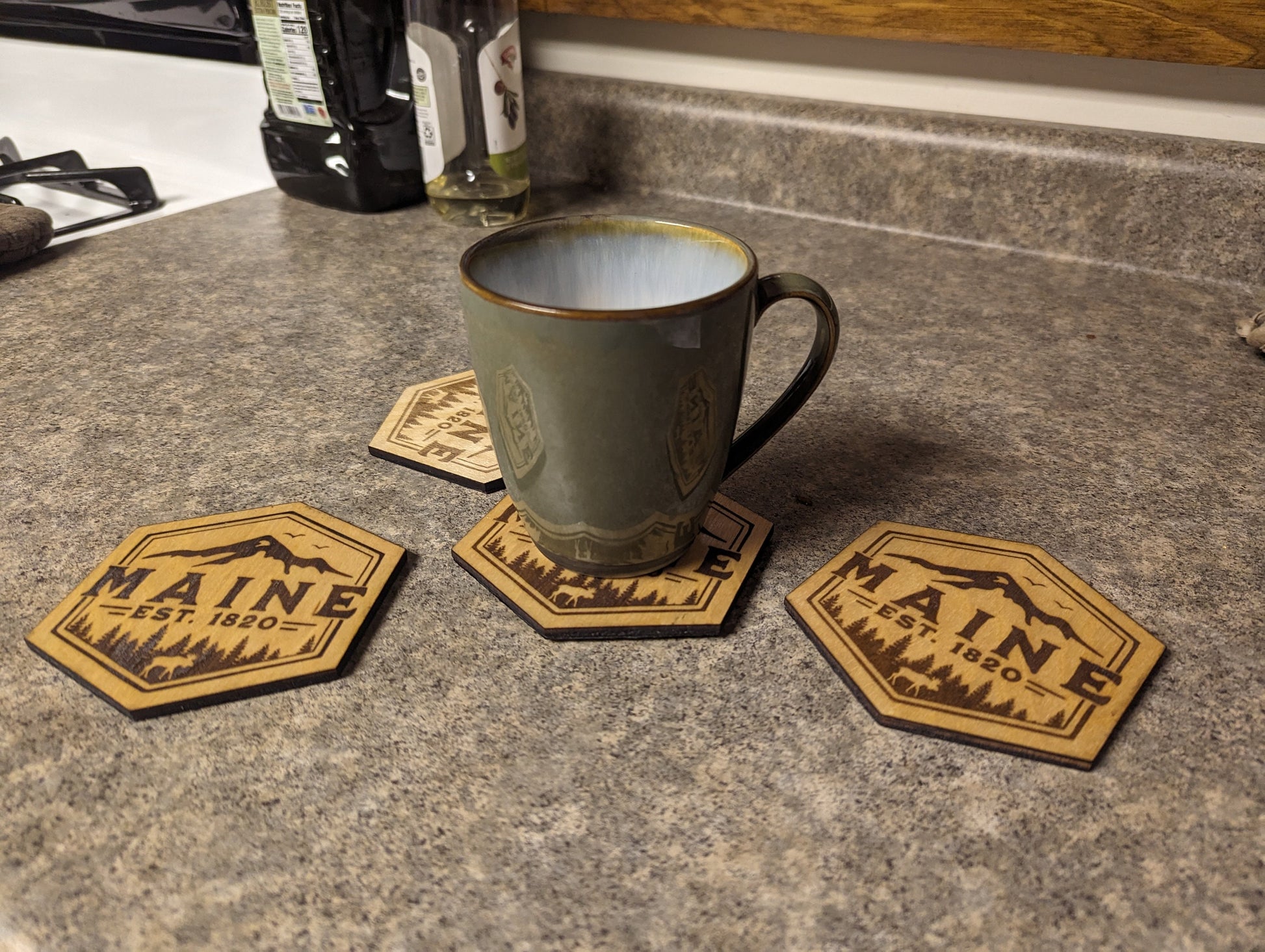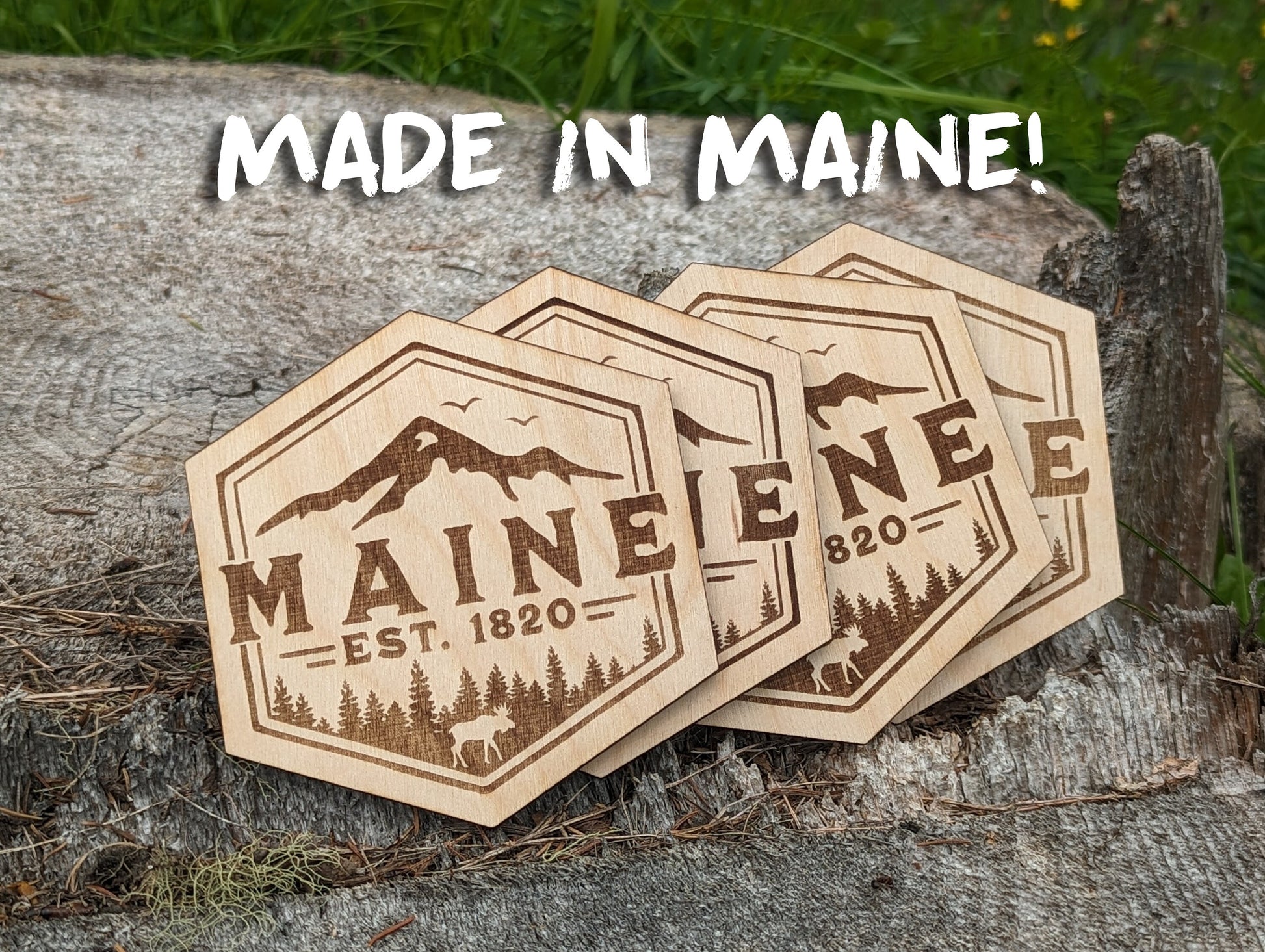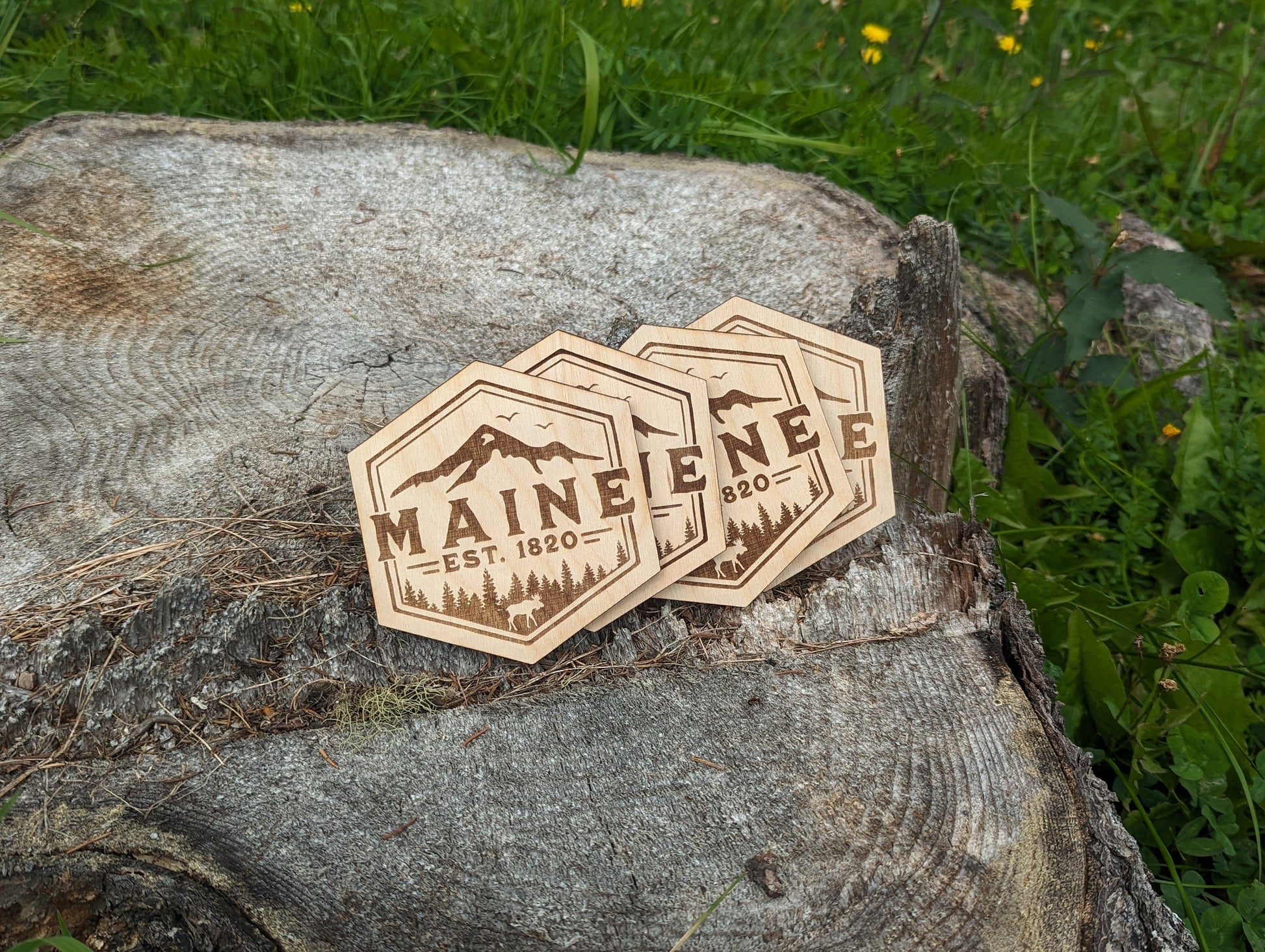 Elevate your home decor with these birch wood Coasters, crafted in the north of Maine. Whether you're a proud resident or cherish fond memories of your visit to the Pine Tree State, these coasters serve as both a tribute and a functional piece of art. Imbued with Maine's rustic charm, each coaster has two layers of polyurethane, ensuring longevity and resilience. The thoughtful addition of a cork bottom not only enhances stability but also safeguards your surfaces from any potential scratches. Bring a touch of Maine's natural beauty into your space with these handcrafted birch wood coasters, where craftsmanship meets functionality.